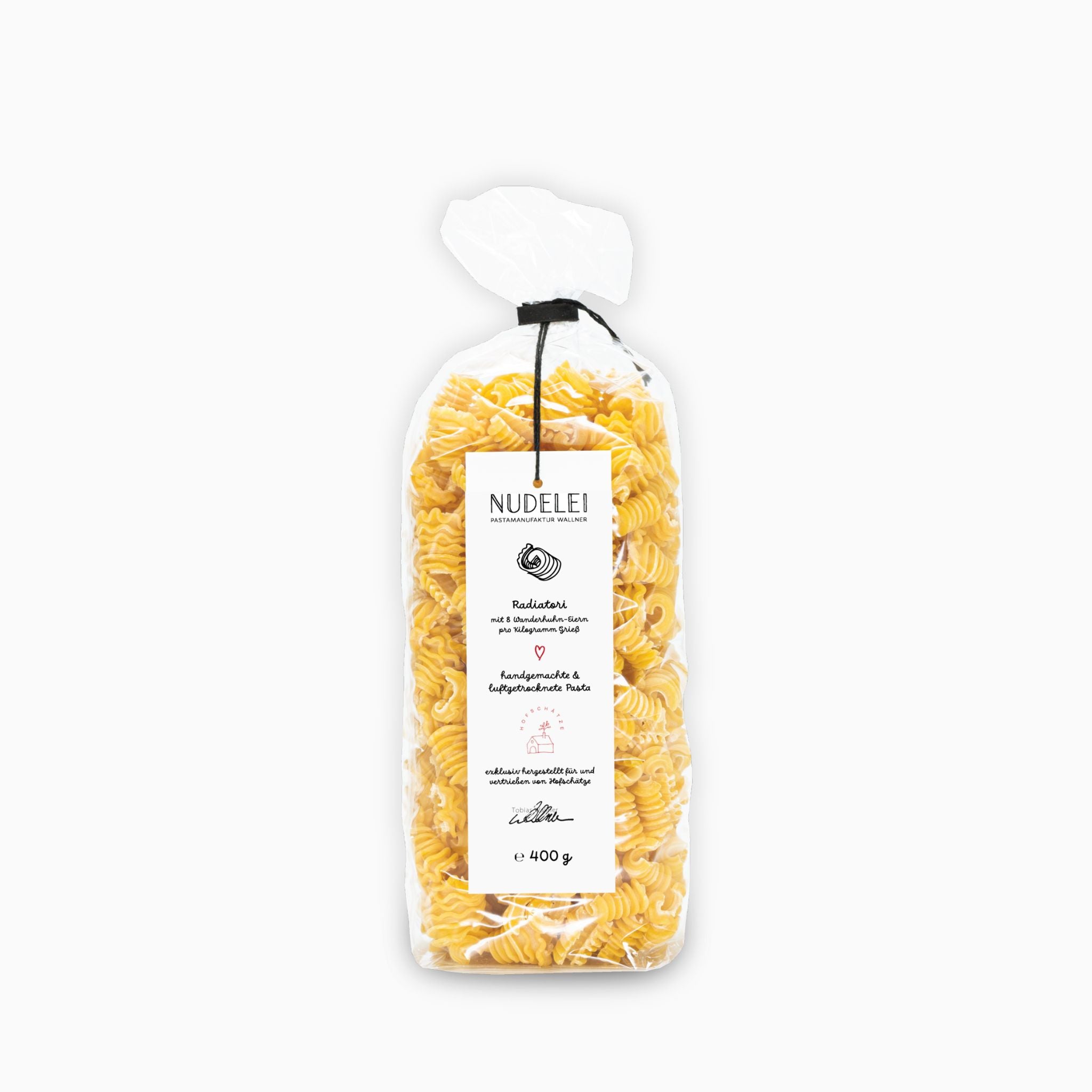 Handgemachte, luftgetrocknete Pasta mit 8 Eiern pro Kilogramm Grieß aus mobiler Freilandhaltung in Österreich.